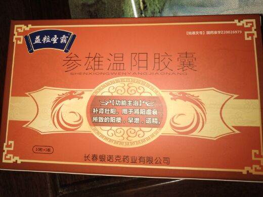 长春银诺克药业有限公司“参雄温阳胶囊(国药准字Z20026979)”是经国家药品监督管理局批准生产的,其功能主治:补肾壮阳。用于肾阳虚衰所致的阳痿,早泄,遗精。“益粒圣霸”可能是该产品在包装盒上使用的商标。