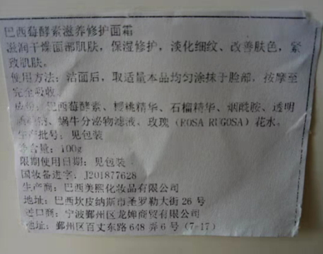 国妆备进字J201877628这个能查到吗?巴西莓酵素滋养修护面霜;65元,在乌兰察布世博会买的。我就想知道这个是真的假的,安不安全?我就是逛街看到了就买了,看到包装上面有国妆备进字就想查一下,应该没啥关系吧,其他的我也不知道了。生产厂家:巴西美熙化妆品有限公司。