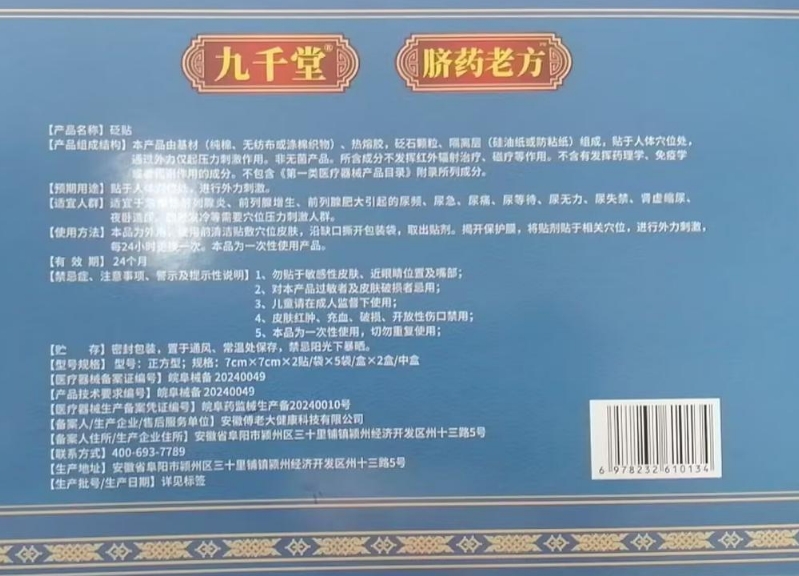 九千堂脐药老方砭贴,6978232610134,皖阜械备20240049,安徽傅老大健康科技有限公司