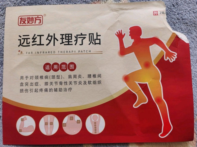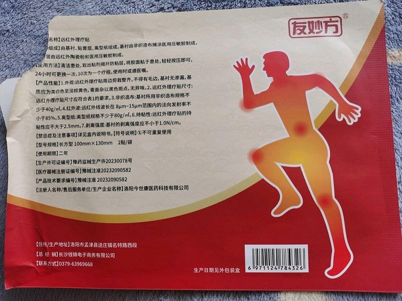 经查,洛阳今世康医药科技有限公司的“远红外理疗贴(豫械注准20232090582)”属于第二类医疗器械(不是药品,不含药物成分,不能代替药物功效),产品由基衬、贴膏层、离型纸组成。基衬由非织造布摊涂医用压敏胶制成,贴膏层由远红外陶瓷粉和医用压敏胶制成。适用范围:用于对颈椎病(颈型)、肩周炎、腰椎间盘突出症、膝关节骨性关节炎及软组织损伤引起疼痛的辅助治疗。“友妙方”可能是该产品在包装上使用的商标。