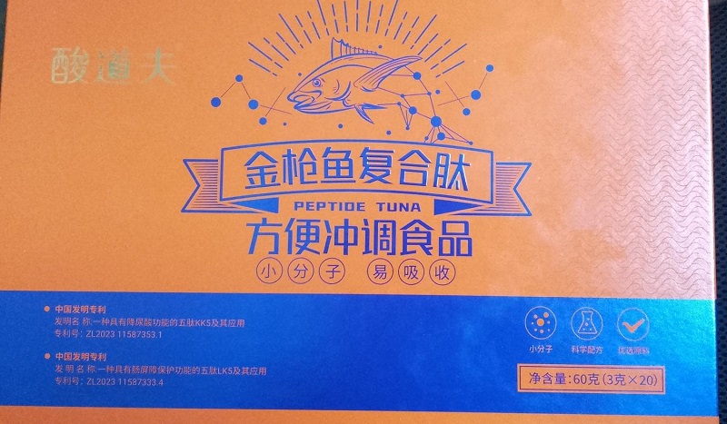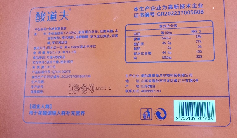 酸道夫金枪鱼复合肽是正品吗?金枪鱼复合肽(酸道夫),生产企业:烟台嘉惠海洋生物科技有限公司,食品生产许可证编号:SC10737063600734,条形码:6955189201608。