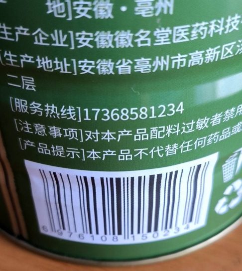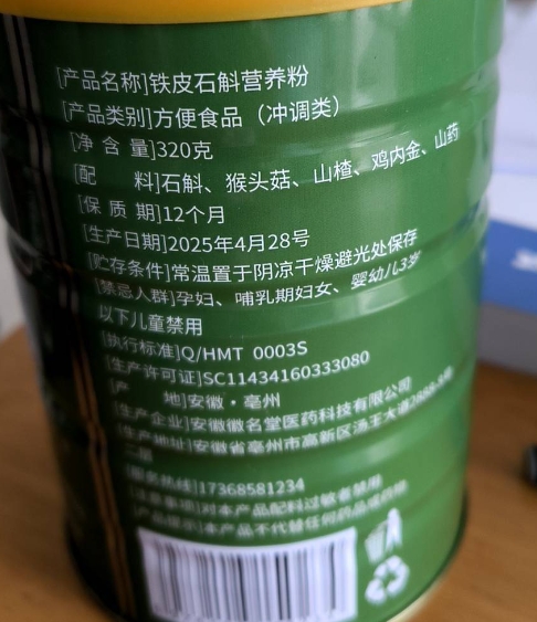 经核查,食品生产许可证号“SC11434160333080”原属于安徽徽名堂医药科技有限公司,但安徽省市场监督管理局数据库显示该证书已于2025年7月24日注销,请消费者谨慎选择;此外,“尊义堂铁皮石斛营养粉”为普通食品,非药品或保健食品,没有具体的保健功能或治疗功效,食用前请注意查看生产日期。