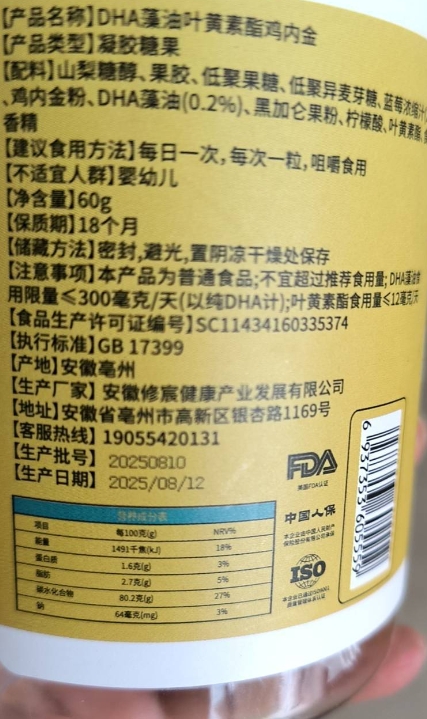 DeeloHoo DHA藻油叶黄素酯鸡内金凝胶糖果,SC11434160335374,安徽修宸健康产业发展有限公司,6937353605559