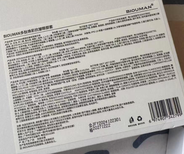 国家药监局数据库展示的“BIOUMAN多肽焕彩抗皱眼部套”包装照片显示,“BIOUMAN眼部抗皱紧致精华液”的功效:滋润眼周肌肤,改善眼周粗糙,淡化眼周眼纹,紧致眼周,赋予肌肤水润光泽,柔嫩保湿。“BIOUMAN多肽时光精华眼膜”的功效:保湿、滋润眼部肌肤,使肌肤水润柔滑。“BIOUMAN三型胶原抗皱紧致眼霜”的功效:清透轻盈质地,易于吸收,滋润眼周肌肤,紧致提拉眼部肌肤,使眼周肌肤嫩滑,赋予眼部肌肤沁嫩柔润。