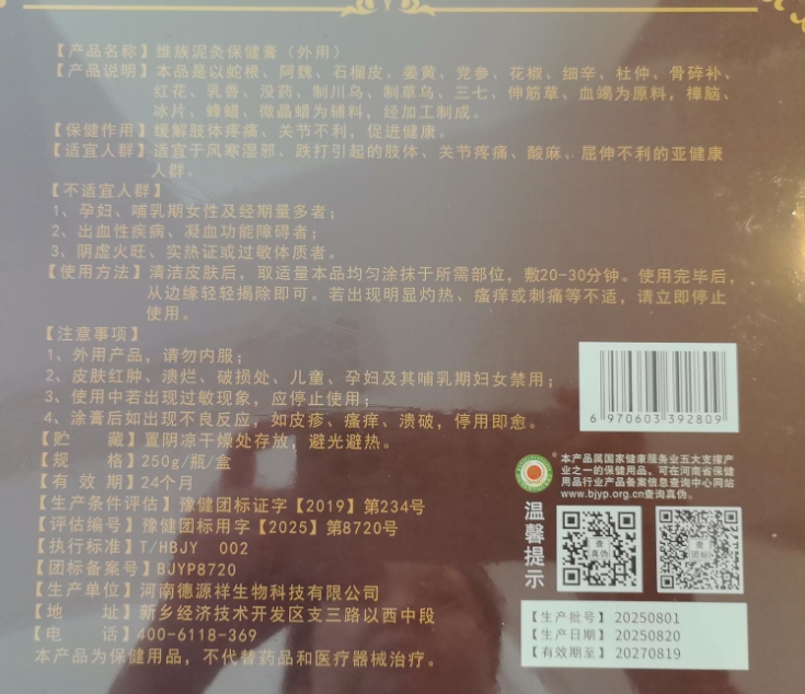 这个是你们店里的吗?这个是我家老人买的,看到这个,我担心他受骗,所以问下。友良医维族泥灸保健膏(外用),生产条件评估:豫健团标证字【2019】第234号;评估编号:豫健团标用字【2025】第8720号;执行标准:T/HBJY 002;生产单位:河南德源祥生物科技有限公司,6970603392809