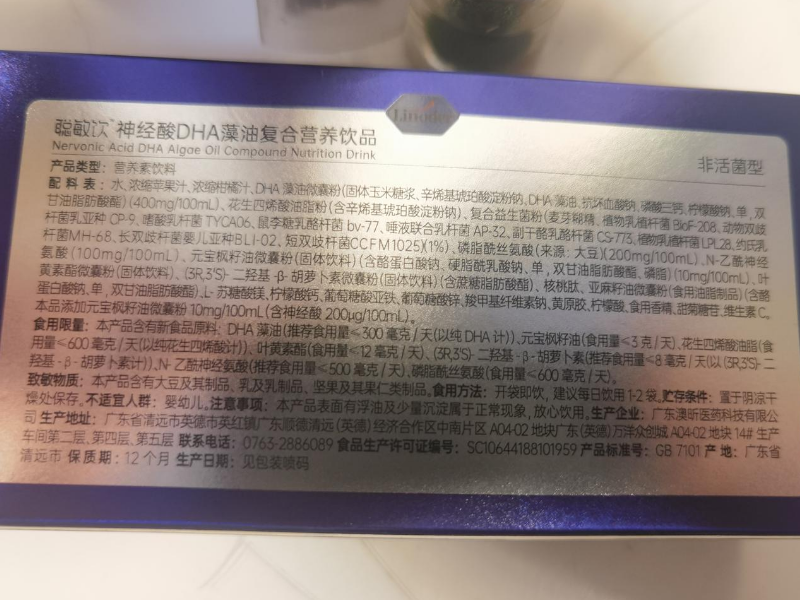 经查,没有名称为“神经酸DHA藻油复合营养饮品”的药品或保健食品注册/备案,“SC10644188101959”是广东澳昕医药科技有限公司的食品生产许可证号。上述“Linoder聪敏饮神经酸DHA藻油复合营养饮品”属于普通食品,既不是药品也不是保健食品,没有具体的保健功能或治疗功效,请消费者谨慎选择。