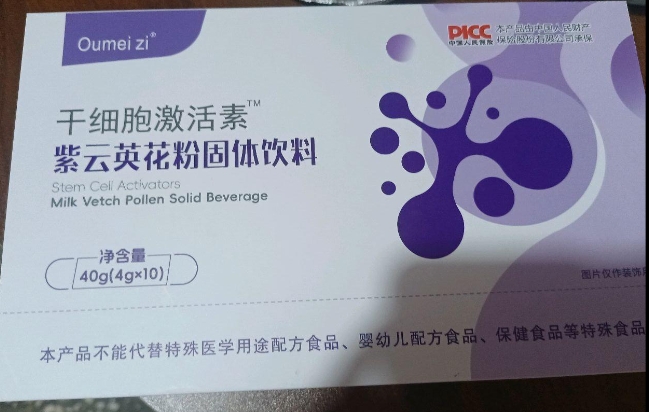 该产品包装上标注的“干细胞激活素”是一个尚未成功注册的TM商标,紫云英花粉固体饮料属于普通食品,而不是药品,普通人群按包装说明适量食用一般是安全的。