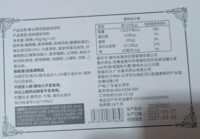 经查,没有名称为“紫云英花粉固体饮料”的药品或保健食品注册/备案。“SC10644530200645”是广东春华药业有限公司的食品生产许可证。“oumeizi干细胞激活素紫云英花粉固体饮料”属于普通食品,既不是药品也不是保健食品,没有具体的保健功能或治疗功效,请消费者谨慎选择。