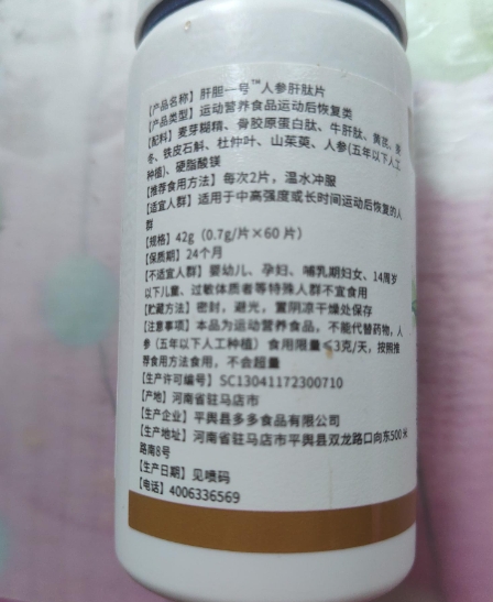 经查,没有名称为“人参肝肽片”的药品或保健食品注册/备案。“SC13041172300710”是平舆县多多食品有限公司的食品生产许可证。“薛神医肝胆一号人参肝肽片”属于普通食品,既不是药品也不是保健食品,没有具体的保健功能或治疗功效,请消费者谨慎选择。