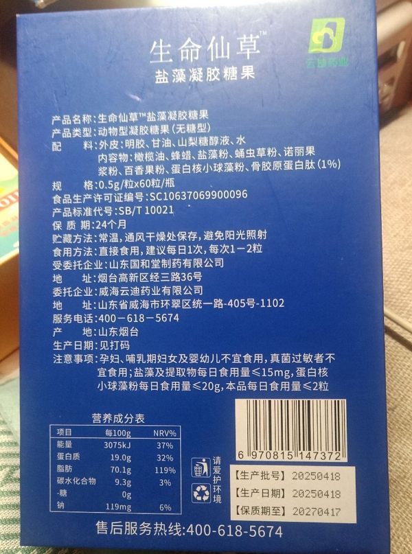 我想问一下山东国和堂制药有限公司生产的生命仙草盐藻凝胶糖果多少钱一瓶?条码:6970815147372,委托企业:威海云迪药业有限公司,受托企业:山东国和堂制药有限公司,许可证:SC10637069900096