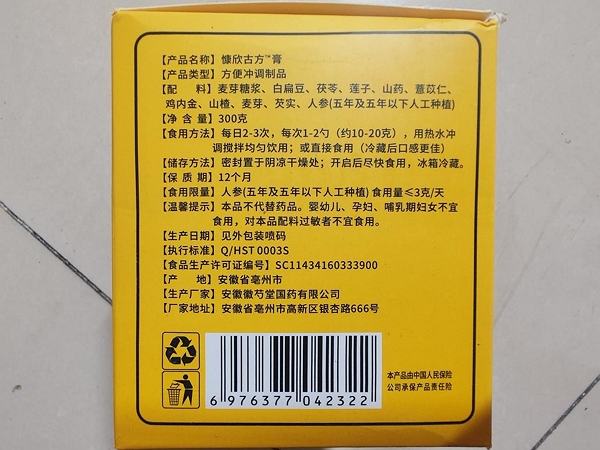 慷欣古方膏是真的吗?安徽徽芍堂国药有限公司;生产许可:SC11434160333900;条码:6976377042322。