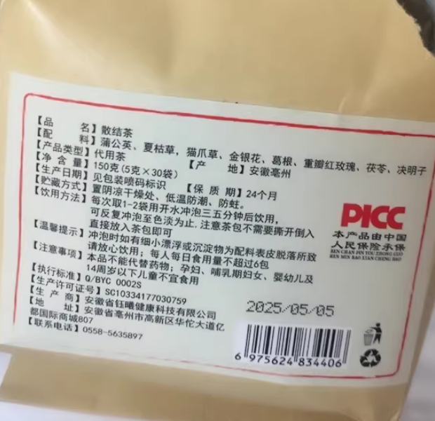 帮查一下源仁堂散结茶是不是真的有效?看到有人在卖。生产许可证号:SC10334177030759;生产厂家:安徽省钰曦健康科技有限公司;条形码:6975624834406。