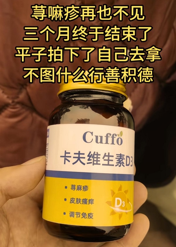 药品价格315网提醒您:上面图片对“Cuffo卡夫维生素D3”的描述“荨麻疹、皮肤瘙痒、调节免疫。荨嘛疹再也不见三个月终于结束了”等内容使用了医药术语,宣称或暗示保健功能或治疗功效,且不科学断言效果,涉嫌违法广告虚假宣传欺骗消费者,请消费者不要轻信。