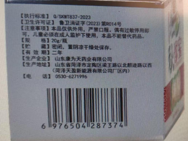“鲁卫消证字(2023)第R014号”曾是山东康为天药业有限公司的《消毒产品生产企业卫生许可证》证号,但该企业于2024年05月20日已注销。“顽达康独秘珍宝”可能曾属于消毒产品,不是药品,不能代替药品治疗功效,请消费者谨慎选择,使用前注意查看包装上的生产日期和有效期。