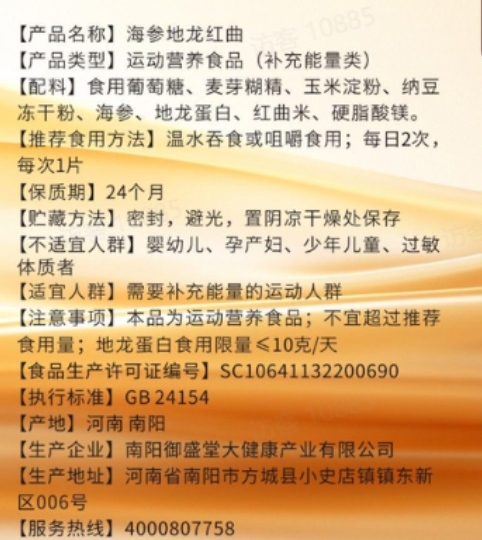 薛神医溶栓一号海参地龙红曲特殊膳食,食品生产许可证编号:SC10641132200690;生产企业:南阳御盛堂大健康产业有限公司;6975631841633