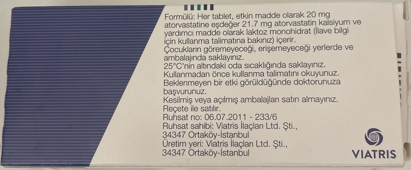 “atorvastatin”即“阿托伐他汀”。上述“LIPITOR atorvastatin 20mg Film Kapli Tablet”没有中文标签,可能是土耳其流通的包装,没有经过正规进口程序,对于这种情况,很难通过仅查看包装照片判断真假,请消费者谨慎选择。该药品有中国进口包装,即“立普妥阿托伐他汀钙片”。