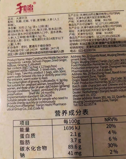 和治大建中汤,生产企业:天津和治药业集团有限公司(代码A),食品生产许可证编号:SC12712011400299;生产企业:天津中威和治药业有限公司(代码B),食品生产许可证编号:SC12712011500236。