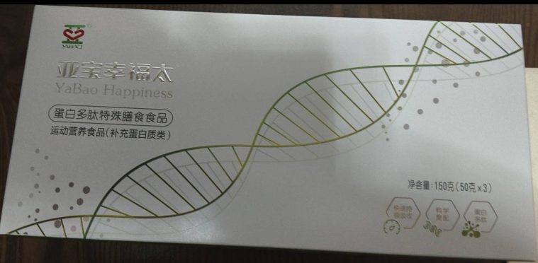 亚宝幸福太蛋白多肽特殊膳食食品属于普通食品。物码中心展示条码“6928463125983”的注册产品名称:亚宝幸福太蛋白多肽特殊膳食食品,品牌名称:亚宝幸福太,规格:50g/小盒*3小盒/中盒,发布企业:山东健康源生物工程有限公司,条码的注册信息与上述“亚宝幸福太蛋白多肽特殊膳食食品”包装照片信息一致。