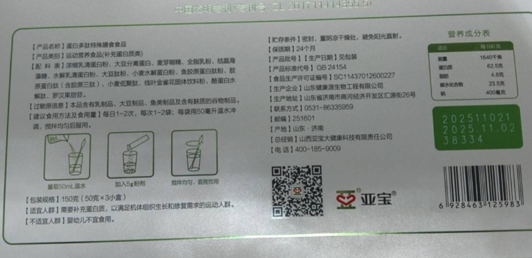 是正品吗?亚宝幸福太蛋白多肽特殊膳食食品,山东健康源生物工程有限公司,SC11437012600227,6928463125983
