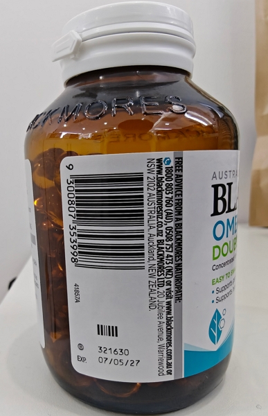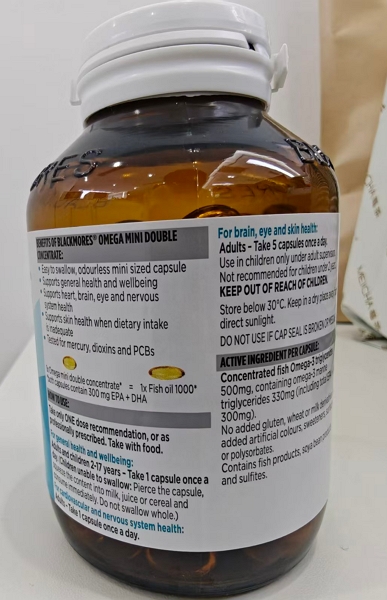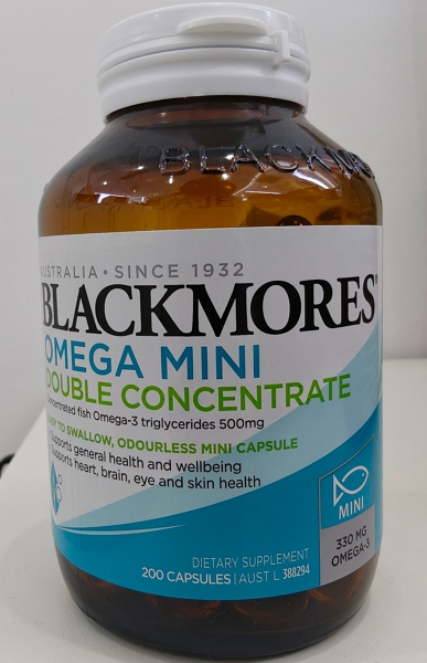 经查澳大利亚ARTG数据库,“BLACKMORES OMEGA MINI DOUBLE CONCENTRATE”是Blackmores Ltd注册的列册药品,ARTG ID为“388294”,该产品成分为浓缩鱼油Omega-3甘油三酯(concentrated fish Omega-3 triglycerides)。