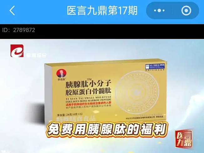 在《医言九鼎》栏目中,李成森教授所介绍的“逆糖疗法”可能包含多种方式对身体进行干预,涉及的产品可能包含“李成森胰腺肽小分子胶原蛋白骨髓肽”。需要说明的是,上面包装上的“胰腺肽”只是一个尚未成功注册的TM商标,美国FDA也没有批准或备案名称为“胰腺肽”的药物。