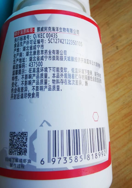 真假葯鉴别。天合人康的磷虾油。6973585818992,SC12742122350105,生产商:湖北康恩萃药业有限公司