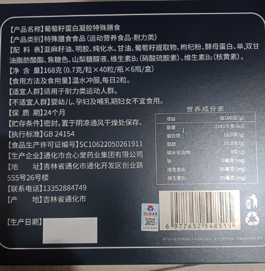 物码中心展示条码“6977652548515”的注册名称是“葡萄籽提取物蛋白凝胶夹心”,规格为168克,品牌为“鹿悬壶”,发布企业为“通化市合心堂药业集团有限公司”。但其包装照片显示的产品名称是“葡萄籽蛋白凝胶特殊膳食”,与条码注册信息不一致。建议消费者联系通化市合心堂药业集团有限公司或吉林省市场监督管理局进一步核实。