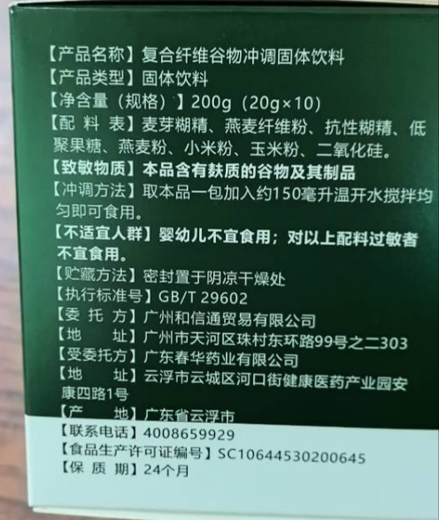 经查,没有名称为“复合纤维谷物冲调固体饮料”的药品或保健食品注册/备案。“SC10644530200645”是广东春华药业有限公司的食品生产许可证。上述“联合美康复合纤维谷物冲调固体饮料”属于普通食品,既不是药品也不是保健食品,没有具体的保健功能或治疗功效。