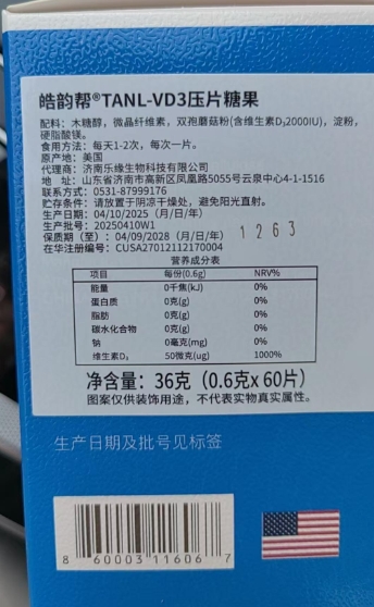 能帮我查个药么?不算药品?或者保健品?但这是医院给开的!皓韵帮TANL-VD3压片糖果,条码:860003116067,在华注册编号:CUSA27012112170004,代理商:济南乐缘生物科技有限公司