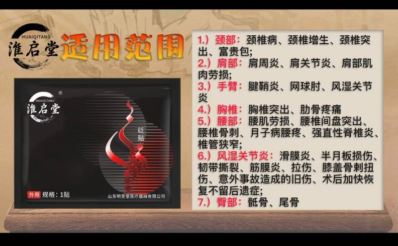 药品价格315网提醒您:上述“淮启堂砭贴”宣传图片中对其描述如下:“适用范围:1.) 颈部:颈椎病、颈椎增生、颈椎突出、富贵包;2.) 肩部:肩周炎、肩关节炎、肩部肌肉劳损;3.) 手臂:腱鞘炎、网球肘、风湿关节炎;4.) 胸椎:胸椎突出、肋骨疼痛;5.) 腰部:腰肌劳损、腰椎间盘突出、腰椎骨刺、月子病腰疼、强直性脊椎炎、椎管狭窄;6.) 膝关节:滑膜炎、半月板损伤、韧带撕裂、筋膜炎、拉伤、膝盖骨刺、扭伤、意外事故造成的旧伤、术后加快恢复不留后遗症;7.) 臀部:骶骨、尾骨问题”。该描述与该产品备案的预期用途不一致,涉嫌违反广告法,存在虚假宣传和欺骗消费者的行为。请广大消费者谨慎辨别,勿轻信上述宣传内容。