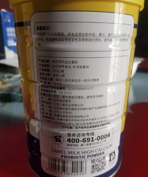 深爱牧场鸵鸟高钙益生菌粉特殊膳食食品请问这是真的骆驼奶吗?深爱牧场驼奶高钙益生菌粉特殊膳食食品,食品生产食品许可证编号:SC10736098210111;生产厂家:江西上善实业有限公司;条形码:6925493852056。