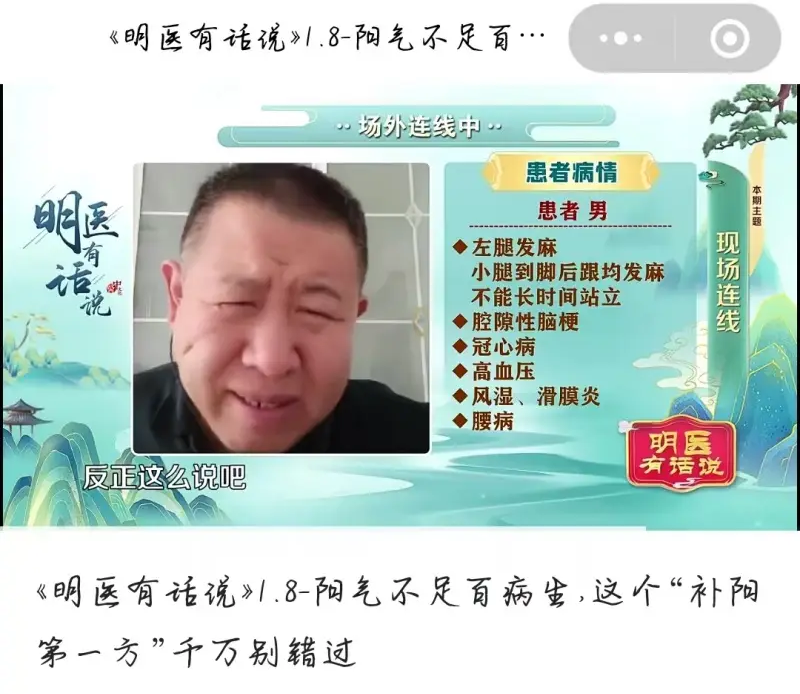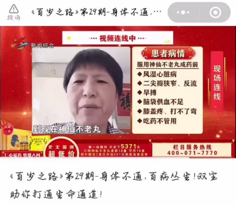 曝光神药节目,百岁之路,健康本草,医路同行,爱上古中医(于晓津,红彦,推销康欣口服液)五仙传医(史士昊推销五仙膏)明医有话说(推销龟芪参口服液)全部号称能治疗多种疾病,但药品说明书上主治功能并没有他们说的疾病!另外请演员演患者!