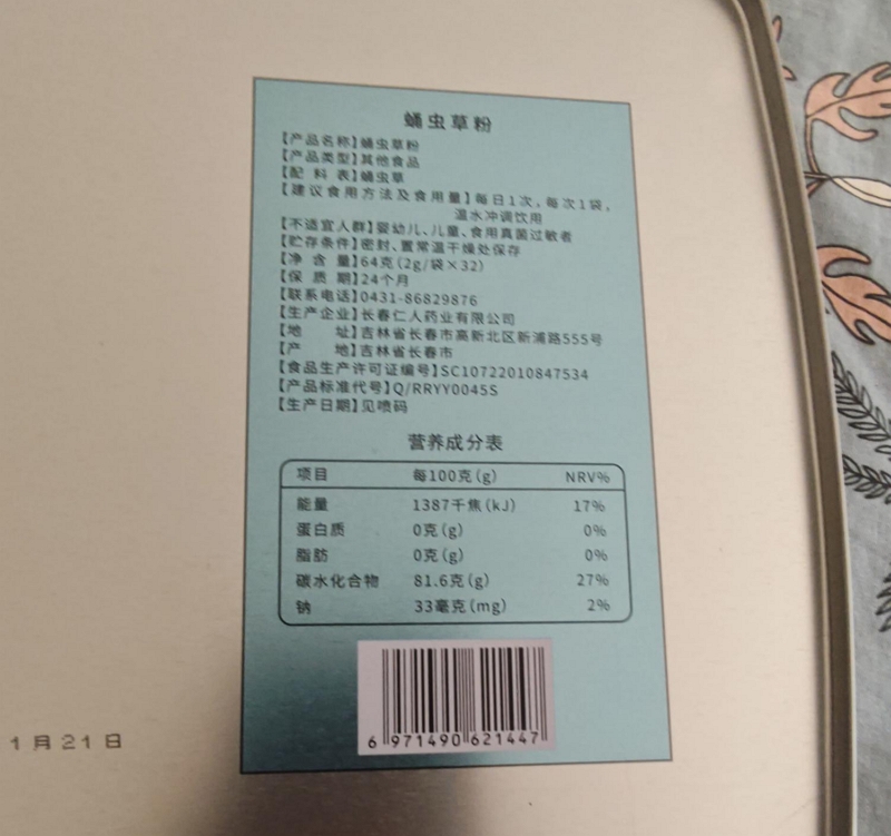 生修草堂蛹虫草粉真的假的?生产企业:长春仁人药业有限公司,许可证:SC10722010847534,条码6971490621447。