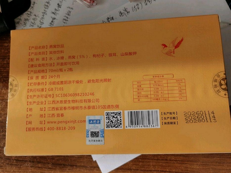 禹生堂燕窝饮品是正品吗?燕窝饮品(禹生堂),生产企业:江西沐恩堂生物科技有限公司,生产许可证号:SC10636098210246,条形码:6950914882367。