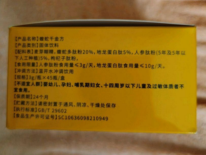 经查,没有名称为“蝮蛇千金方”的药品或保健食品注册/备案,“SC10636098210949”是江西诺华生物科技有限公司的食品生产许可证号。“邦瑞卫士蝮蛇千金方固体饮料”属于普通食品,既不是药品也不是保健食品,没有具体的保健功能或治疗功效,请消费者谨慎选择。