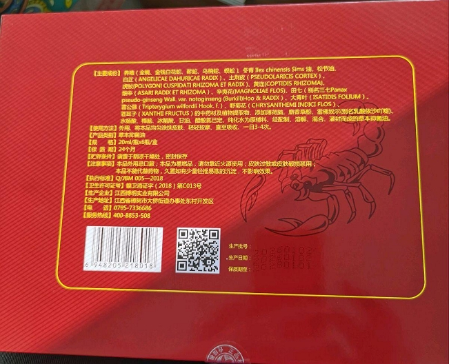 博明安康神油蝎子风湿活络油是真的吗?有什么效果?江西博明实业有限公司;许可证号:赣卫消证字(2018)第C013号;条码:6948205218018。