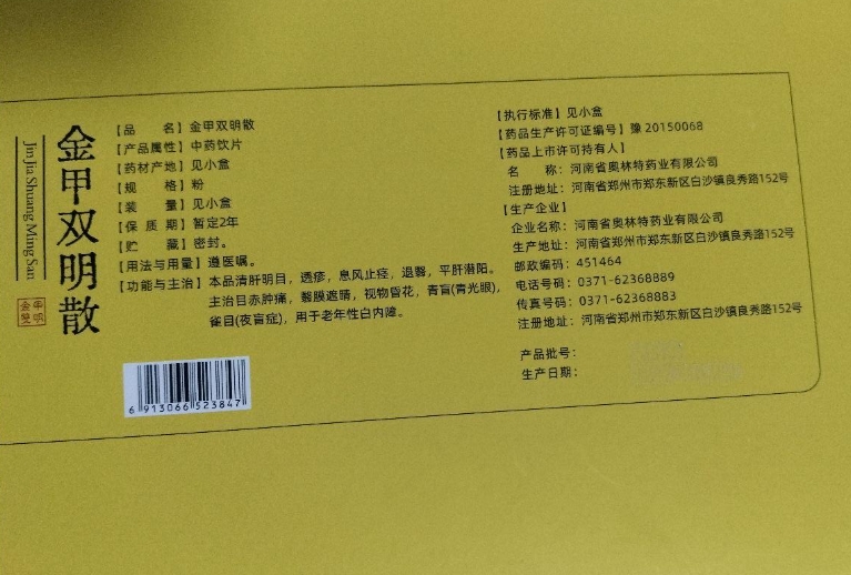 产品属性与国家标准不符:该产品包装标示为“中药饮片”。然而,查询《中国药典》及相关中药饮片标准数据库,均无名为“金甲双明散”的饮片品种记录,其作为“中药饮片”的身份认定缺乏权威标准支持。