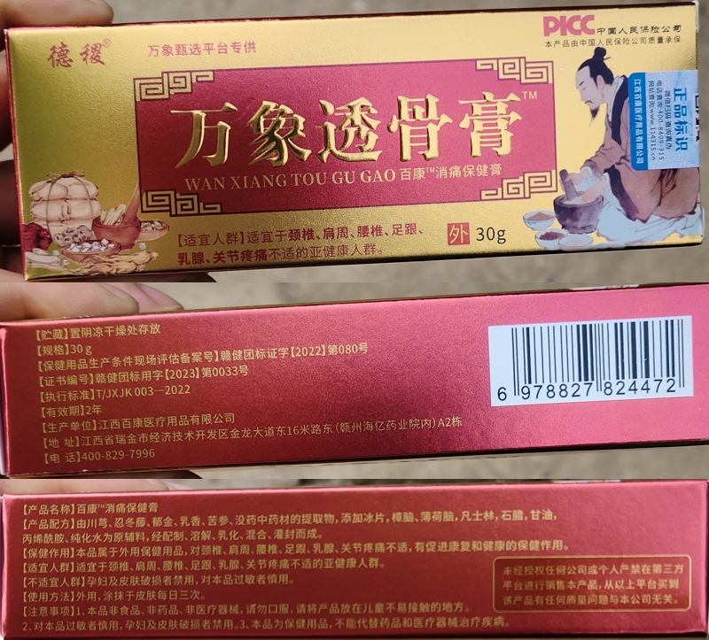 德稷万象透骨膏百康消痛保健膏不是药品,不能代替药品功效。