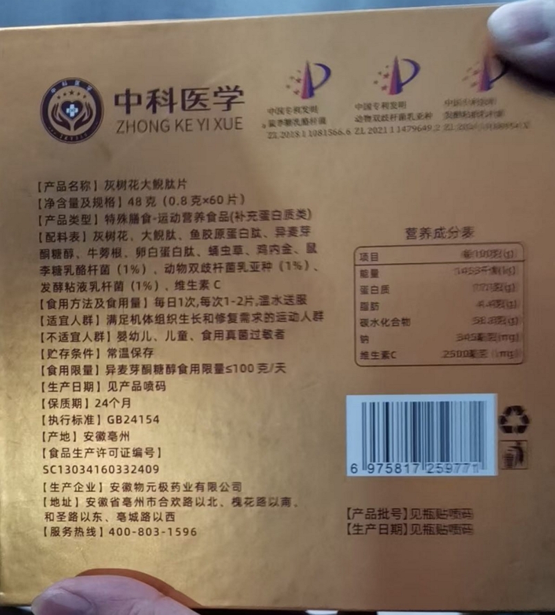 中科医学灰树花大鲵肽片是真的吗?条码:6975817259771,许可证:SC13034160332409,生产企业:安徽物元极药业有限公司。