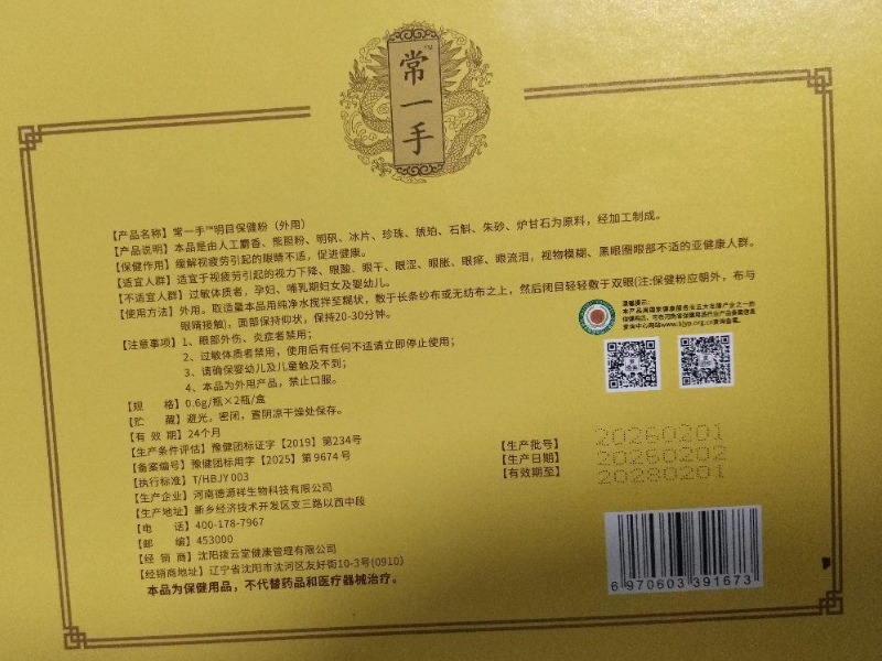 常一手明目保健粉多少钱一盒?能不能治疗视神经萎缩?备案编号:豫健团标用字[2025】第9674号;生产企业:河南德源祥生物科技有限公司;条形码:6970603391673。