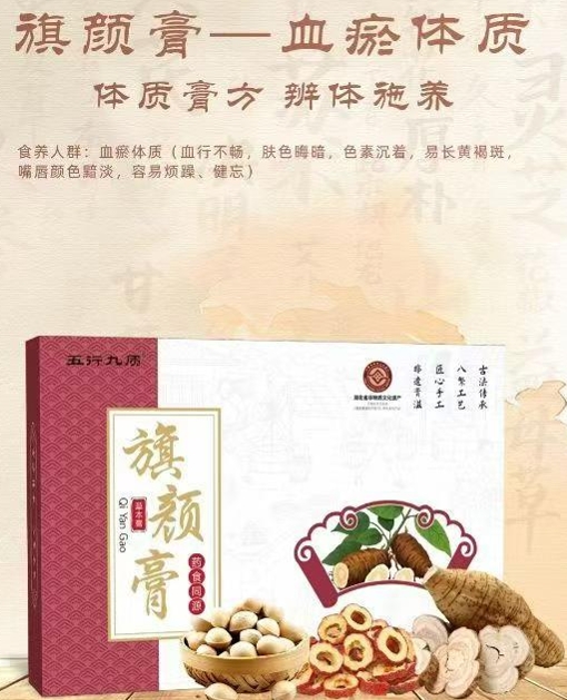 药品价格315网提醒您:上述“五行九质旗颜膏”宣传图片展示的“食养人群:血瘀体质(血行不畅,肤色晦暗,色素沉着,易长黄褐斑,嘴唇颜色黯淡,容易烦躁、健忘)”等内容使用医药术语,宣称或暗示治疗功效,涉嫌违法广告虚假宣传欺骗消费者,请消费者不要轻信。